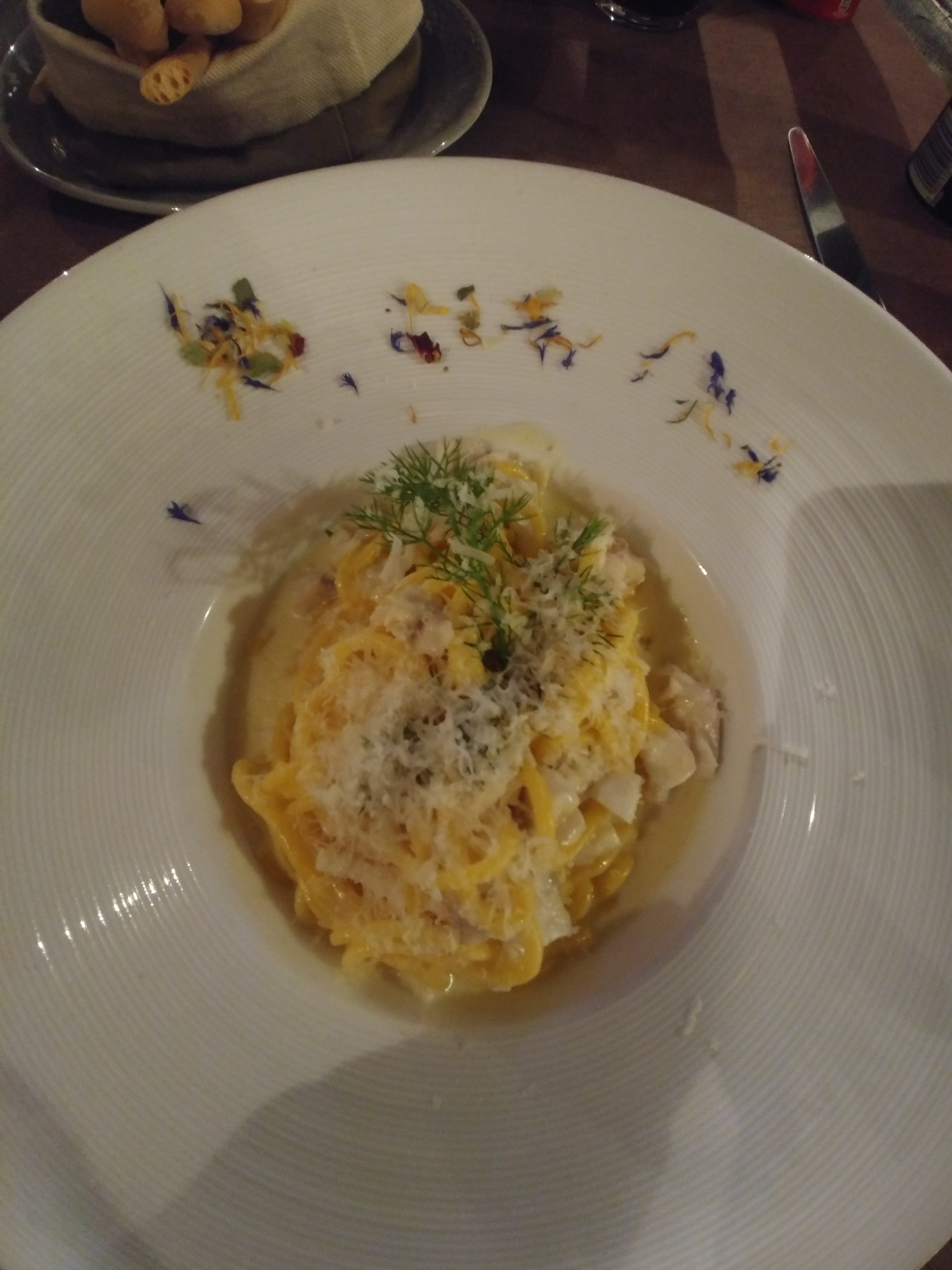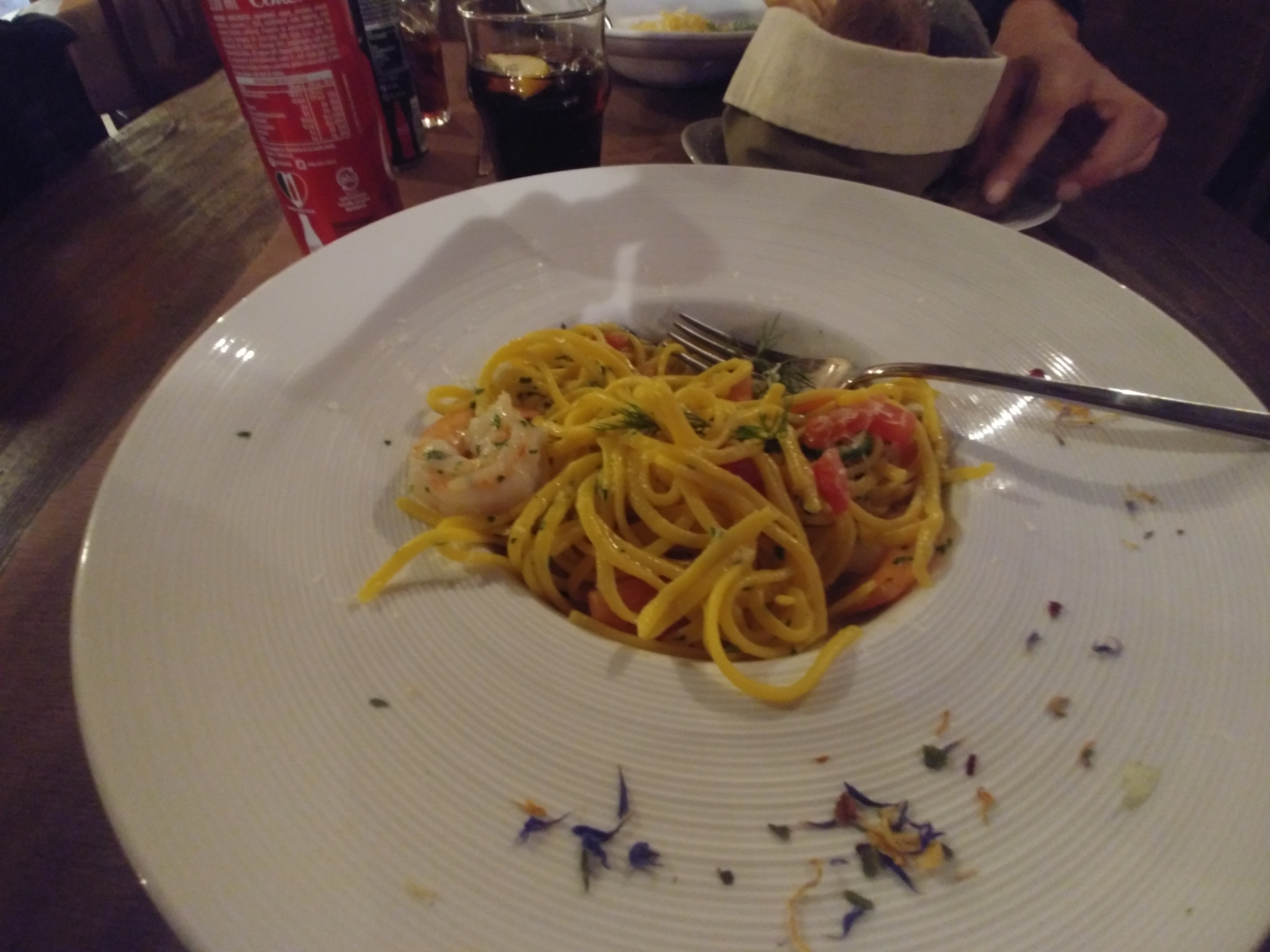 The menu gives you an extensive selection of pastas and pizzas to choose from. I decided to go with a Tagliatelle pasta prepared in a creamy sauce with Seabass. The combination of fish and pasta sounded good. As soon as I put the first forkful into my mouth I could taste the difference between authentic pasta, made today, and the pasta I am used to eating which comes out of a box in my kitchen pantry. I savoured every mouthful and tried to taste each ingredient in this simple but tasty dish.